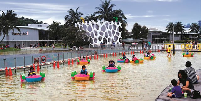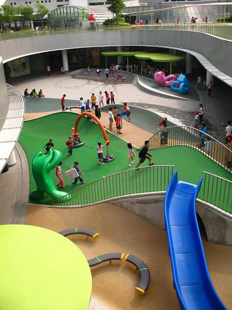 Vivo City is one of Singapore’s largest shopping centers and the open-air playground on its second floor is a popular play area for kids. It features a variety of equipment for kids to climb over and under, including a low hill-and-tunnel play area, slides, seesaw and merry-go-rounds. The little ones will love the colorful cute sculptures, while the spinning like “pods” will grab the older kid’s attention. This play court also has an interactive water fountain for children to stay cool. Besides the playground with water features on the second level of the mall, there is also a sky park with a wading pool on the rooftop.