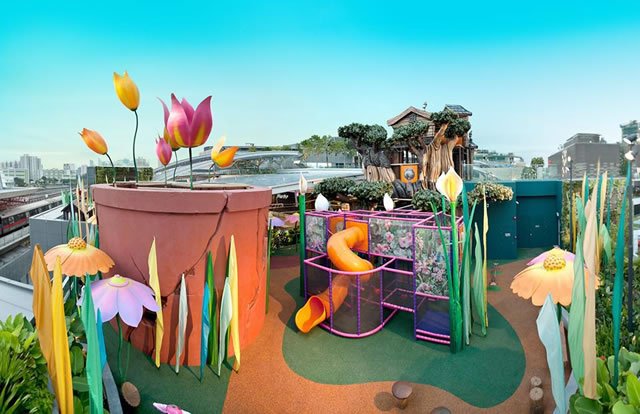 Westgate Wonderland is the largest rooftop mall playground in Singapore. Located on the level 4, it has dry and wet areas with multiple slides, climbing structures and giant insects and flowers in beautiful detail for kids to enjoy. The toddler’s area has some foam animal structures for babies and toddlers to climb around. While the older kids play area features a 10-meter tall tree house with a rock-climbing wall and a flowerpot with slides. The playground water play area has an enormous watering can and is partially sheltered, so kids can cool off. It also offers a blower room and a changing room, all free to use.