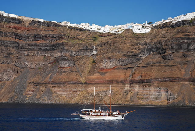 Fira, the capital of Santorini, is a town famous for its white-washed houses built on the edge of a 400-meter (1,312 feet) high caldera on the western edge of the semi-circular island of Thera (more info on Wikipedia). From the top of this picturesque town, you can enjoy magnificent views of a volcano, the deep blue of the sea below and one of the most famous sunsets in the region.